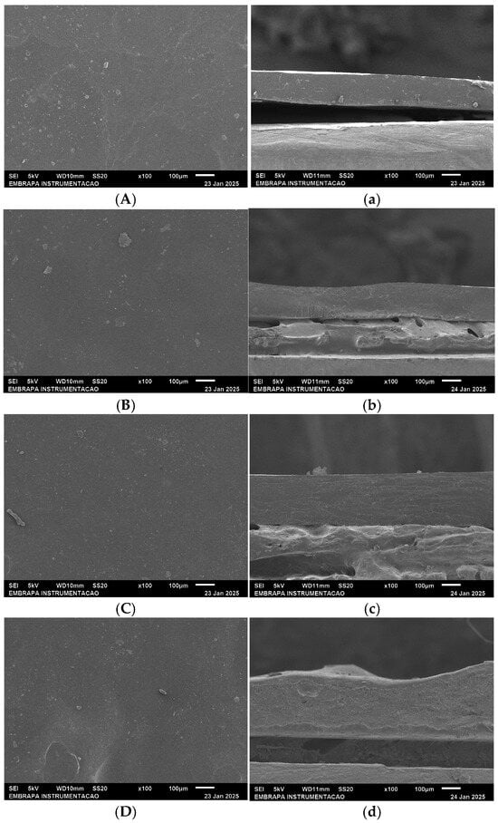 Regarding mechanical properties, AL incorporation resulted in a reduction in tensile strength (TS) and Young’s modulus (E), accompanied by an increase in elongation at break (EB), as shown in Table 3. The decrease in TS may be associated with the formation of discontinuities and heterogeneities in the film matrix caused by the presence of AL, as evidenced by the SEM micrographs in Figure 2.