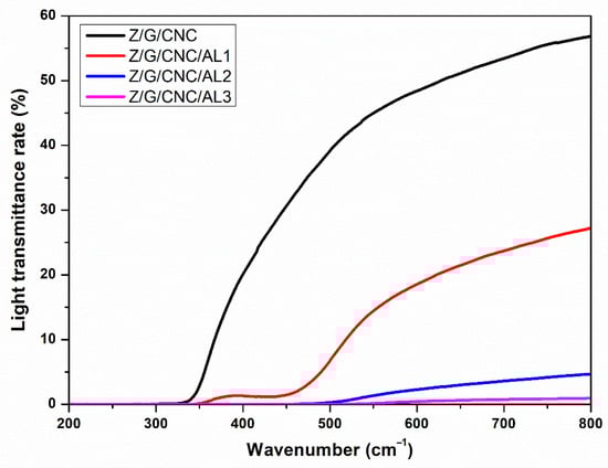 In the visible region (350–800 nm), Z/G/NCC films showed high transmittance, whereas the addition of AL progressively reduced visible light transmittance due to its unsaturated structure []. The barrier effect increased proportionally with AL concentration. Although reduced transparency may be considered a drawback, since it limits product visibility, it can be advantageous for products containing visible light–sensitive compounds, such as riboflavin, myoglobin, and hemoglobin, which absorb light above 400 nm and are prone to quality deterioration under light exposure []. A similar behavior was reported by Xia, Ma, Ma, Yao, Xu, Ji, and Zhang [] for cellulose-based films incorporated with AL.