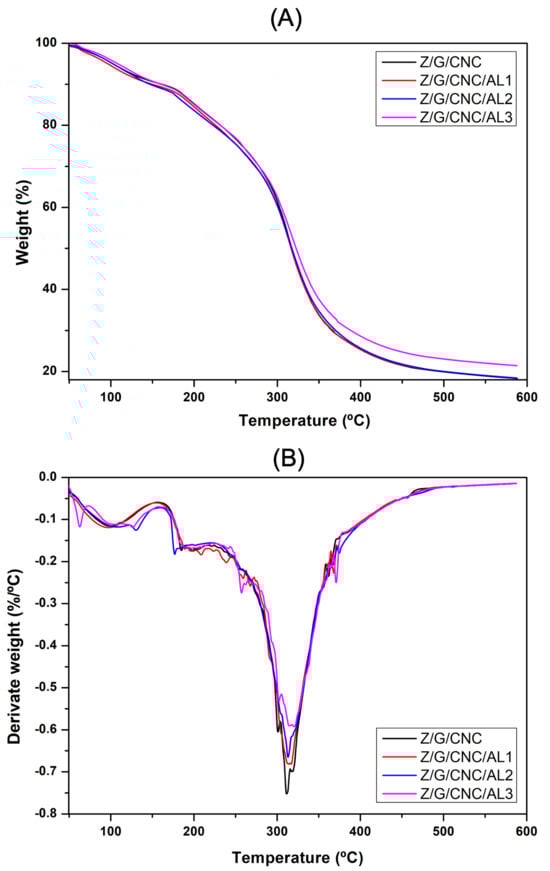 The thermogravimetric (TG) and derivative thermogravimetric (DTG) curves of AL-incorporated films are shown in Figure 4. All films exhibited three distinct weight-loss stages. The first stage (<100 °C) corresponds to the evaporation of residual solvents, such as acetic acid, absorbed by the polymer matrix []. The second stage (150–250 °C) is associated with glycerol evaporation and protein decomposition [], consistent with the glycerol degradation behavior reported by Ezati and Rhim []. The third stage (250–400 °C) involves a marked mass reduction due to AL degradation within the polymer matrix [] and the thermal decomposition of CNC []. This significant weight loss is mainly attributed to sample carbonization and the breakdown of thermally stable structural units in the polymer matrix [].