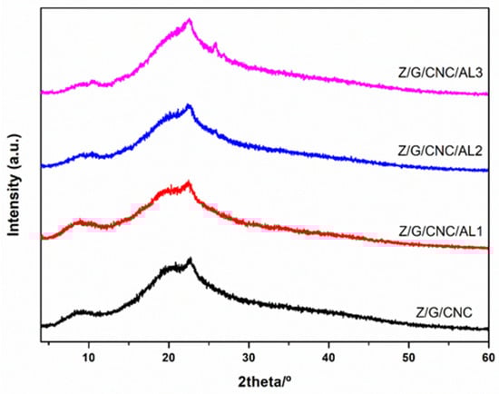 Figure 5 shows the XRD patterns of films incorporated with AL. The diffraction profiles were similar, exhibiting three characteristic peaks at approximately 8.6°, 20.0°, and 22.6°. The peaks at 8.6° and 20.0° are associated with the protein-based biopolymer matrix, whereas the diffraction angle at 22.6° corresponds to the cellulose structure []. These patterns indicate a low degree of crystallinity, which is directly related to the use of acetic acid as a solvent during film preparation []. This effect can be attributed to two main mechanisms: (i) the ability of acetic acid to disrupt the intrinsic crystalline structures of both Z and G, and (ii) its inhibitory effect on recrystallization during the formation of the composite material []. The incorporation of AL did not significantly affect the crystallinity of the films, as no differences were observed between the XRD patterns of AL-containing and AL-free films. A similar result was reported by Zou, Chen, Dou, Zhu, Zhao, Wang, Wang, and Xia [], who found that adding AL to PCL nanofibrous films did not alter the diffraction patterns compared to neat PCL films.