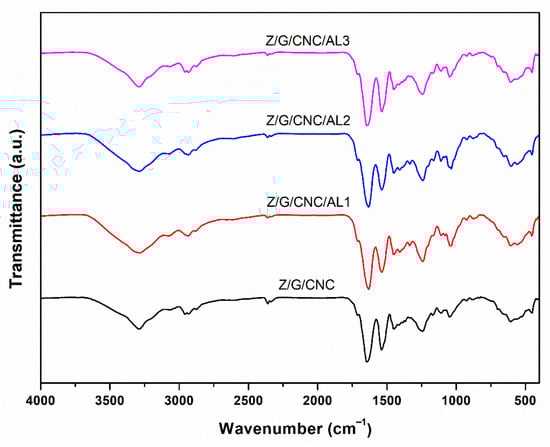 The FTIR spectra (Figure 6) of the zein/gelatin/cellulose nanocrystal (Z/G/CNC) films, with and without AL, displayed similar overall profiles, indicating that the incorporation of AL did not significantly alter the molecular structure of the polymeric matrix. A broad absorption band at 3292 cm−1, assigned to O–H stretching of cellulose nanocrystals [], and weaker C–H stretching at 2937 cm−1 were observed in all samples. Characteristic cellulose bands at 1246 and 1037 cm−1, corresponding to C–O stretching of saccharide units [], remained unchanged, confirming that the polysaccharide component was not structurally affected by the incorporation of AL. The typical protein-related bands were also evident: the amide I band at ~1634 cm−1 (C=O stretching of carbonyl and –COO− groups), amide II at ~1537 cm−1 (N–H bending coupled with C–N stretching), and amide III at ~1242 cm−1 (C–N stretching and in-plane N–H bending) []. Notably, films containing AL exhibited slightly more intense bands at ~1640 and ~1540 cm−1, with the intensity increasing in the order AL1 < AL2 < AL3, which is characteristic of aromatic ring vibrations []. These subtle changes provide clear evidence of the successful incorporation of AL while confirming that its addition did not significantly disrupt the original polymeric network.