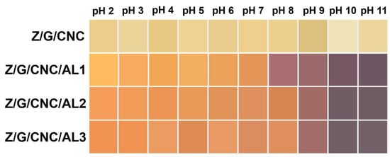 The Z/G/CNC/AL1 film showed a more abrupt color change when exposed to pH 8, suggesting that lower AL concentrations promote greater homogeneity within the polymer matrix (as also evidenced in Figure 2) and, consequently, higher sensitivity and responsiveness to pH variations.