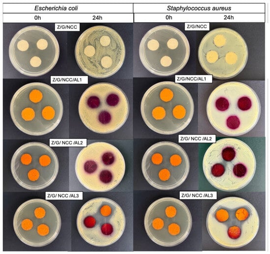 As shown in Figure 8, Z/G/CNC films incorporated with AL exhibited a color change from orange to purple after 24 h of direct contact with E. coli and S. aureus. This response is attributed to the deamination of proteins during bacterial growth, which increases the alkalinity of the medium, resulting in the color shift of the film [].