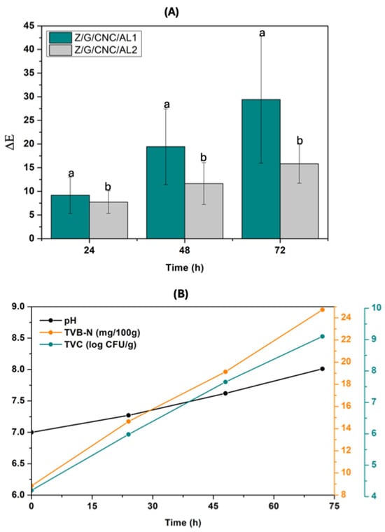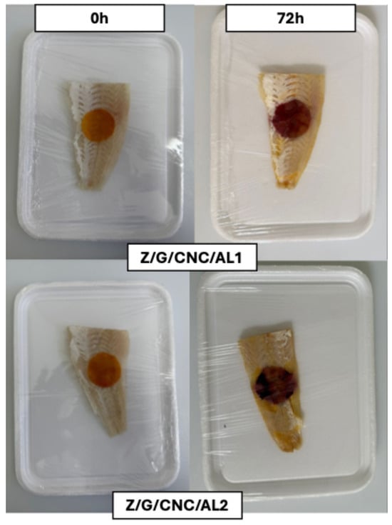 The Z/G/CNC/AL1 and Z/G/CNC/AL2 films were applied to monitor the quality of hake fillets (Figure 9). The ΔE values of the films progressively increased during storage after 24 h, reaching ΔE > 3, indicating a visually perceptible color change (Figure 9A). Initially, the films exhibited an orange hue, which darkened to deep orange after 24 h and shifted to purplish tones as spoilage progressed, reaching 72 h (Figure 10).