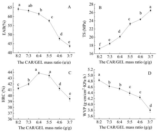 Effect of the CAR/GEL mass ratio on the elongation at break (EAB) (A), tensile strength (TS) (B), hydroxyl radical clearance (HRC) (C), and water vapor permeability (WVP) (D) of the CS/FO-CAR/GEL/GSA/CUR bilayer indicator film. (Different lowercase letters represent significant differences between data points (p < 0.05)).
