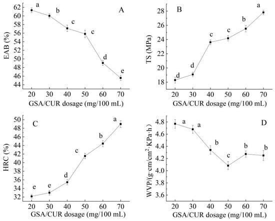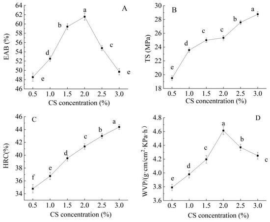 Effect of the CS concentration on the elongation at break (EAB) (A), tensile strength (TS) (B), hydroxyl radical clearance (HRC) (C), and water vapor permeability (WVP) (D) of the CS/FO-CAR/GEL/GSA/CUR bilayer indicator film. (Different lowercase letters represent significant differences between data points (p < 0.05)).