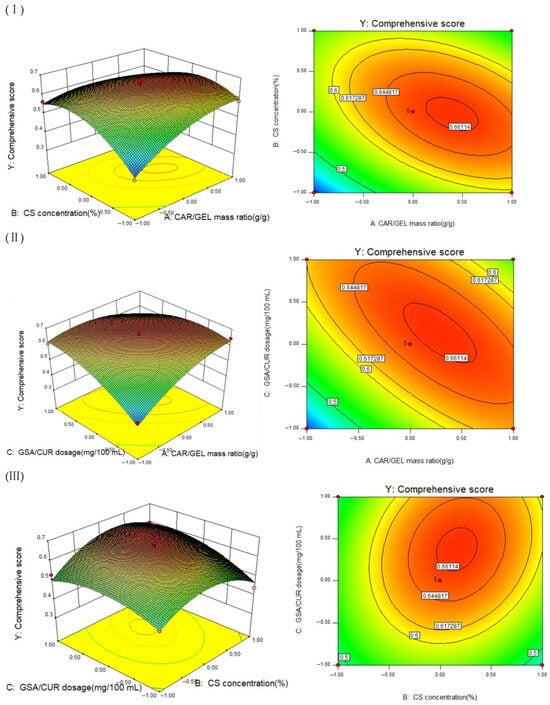 According to the results of single factor analysis, the effect of CAR/GEL mass ratio, CS concentration, and GSA/CUR dosage on the TS and EAB of the films was detected for further response surface test design in the predetermined range. The factor levels and the codes of response surface test design are shown in Table 1.
