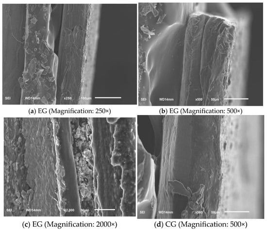 As can be seen from the figures, the CAR (carrageenan)/GEL (gelatin) mass ratio significantly affected the properties of the bilayer film. As the CAR/GEL ratio in the film decreased (CAR reduced, GEL increased), the elongation at break (EAB) significantly decreased (p < 0.05) (Figure 1A), while the tensile strength (TS) significantly increased (Figure 1B). This may be because CAR molecules possess relatively rigid chains that can form a denser three-dimensional network structure, thereby enhancing the rigidity of the material. Films formed solely from CAR exhibited poor mechanical properties and brittleness, whereas the addition of GEL can effectively improve its performance [18].