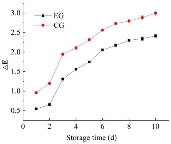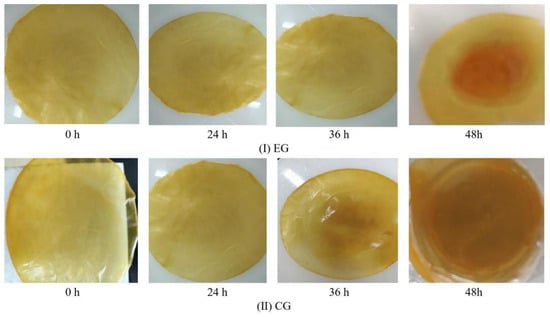 The color changes of indicator films for monitoring fish freshness are shown in Figure 10. During the 48 h storage period, both EG and CG exhibited more pronounced color variations in later stages compared to initial phases. Notably, the EG demonstrated more uniform color transitions, with a distinct progression from yellow to reddish-brown after 36 h. At this time point, the ΔE value of EG measured 9.15 ± 0.95, reaching 15.14 ± 1.26 by 48 h. These chromaticity measurements correlated with the data in Table 8 and aligned with the aforementioned physicochemical parameter trends, confirming that the CS/FO-CAR/GEL/GSA/CUR bilayer indicator film effectively monitored fish freshness through visible color changes corresponding to spoilage status. While current applications of natural pH-responsive macromolecular polymers in fresh meat detection predominantly employ single-indicator monolayer films [59,60,61], the dual-indicator bilayer film developed in this study demonstrated superior performance characteristics. Comparative analysis revealed our innovative film not only achieved enhanced sensitivity but also maintained greater stability throughout the monitoring process. The multi-layered structure with compound indicators provided more reliable and distinguishable colorimetric responses, representing a significant advancement in intelligent packaging technology for real-time freshness assessment.