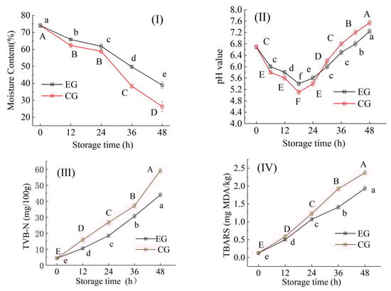 Changes in physical and chemical properties of fish preserved with different films (EG: the experimental group, presented in black lines; CG: the control group, presented in red lines. (I): water content; (II): pH; (III): TVB-N; (IV): TBARS). The a–f: different lowercase letters represented significant differences between EG data (p < 0.05); The A–F: different capital lettersdata represented significant differences between CG data (p < 0.05)).