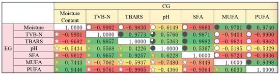 Figure 11 presents the Pearson correlation coefficient matrices between different indicators during the storage of EG and CG, revealing the linear relationships among chemical indicators during food spoilage. Analysis of the EG showed that TVB-N exhibited extremely strong correlations with TBARS (0.986), PUFA (−0.976), and moisture content (−0.990), suggesting their synergistic changes during food spoilage. Moisture content was positively correlated with PUFA (0.945) but negatively correlated with SFA (−0.961), implying that moisture may influence fat oxidation or fatty acid composition. pH showed a significant negative correlation with MUFA (−0.748) but weaker associations with other indicators, possibly reflecting the specificity of microbial or enzymatic processes.