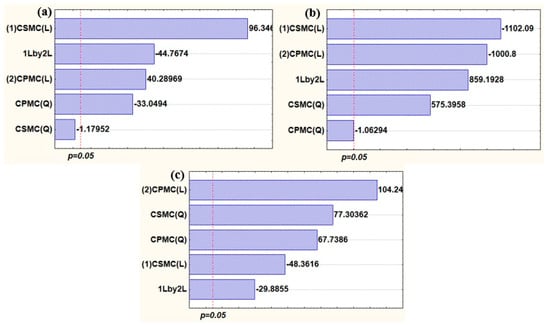 Pareto charts of the response variables: (a) tensile strength—TS; (b) elongation at break—EB; and (c) water vapor permeability—WVP. Note: Independent variables CSMC (corn straw microcellulose content); CPMC (cowpea pod skin microcellulose content). Pareto chart shows the effects of the formulation variables on the measured response. CSMC (L) and CPMC (L) indicate linear effects, and CSMC (Q) and CPMC (Q) indicate quadratic effects of corn straw microcellulose content and cowpea pod skin microcellulose content, respectively. 1Lby2L represents their linear interaction. Effects beyond the red line are statistically significant (p < 0.05).