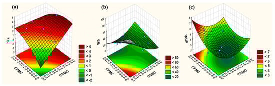 Figure 1c shows that for the water vapor permeability (WVP) response function, CSMC had a positive linear effect, while CPMC exhibited a negative linear effect. Regarding the quadratic effects, both CSMC and CPMC contributed positively to WVP. Lastly, the synergistic interaction between CSMC and CPMC had a negative impact on the WVP response function. The reduction in WVP due to the synergistic interaction between the CMFs in the film formulation was chemically expected. This was because improved hydrogen bonding interactions between the CMFs and the gelatin matrix reduced chain mobility, thereby decreasing WVP [41,42].
