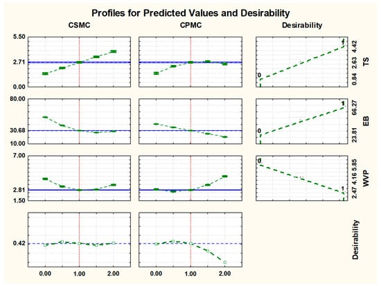 Figure 3 shows the predicted value and desirability profile for the following parameters: tensile strength (TS), elongation at break (EB), and water vapor permeability (WVP).