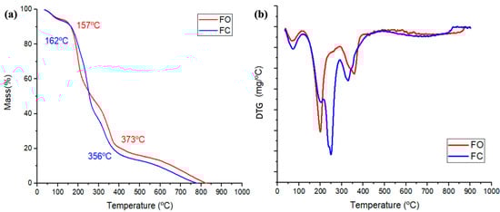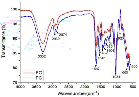A strong and broad absorption band centered around 3302 cm−1 was observed in both FC and FO films. This absorption band generally arises from O–H stretching vibrations, reflecting hydroxyl groups present in cellulose, gelatin, and glycerol molecules [61]. Additionally, two adjacent peaks at approximately 2932 and 2874 cm−1 (FC) and 2920 and 2870 cm−1 (FO) were detected, which are characteristic of the asymmetric and symmetric stretching vibrations of –CH groups in saturated carbon chains. These bands further confirmed the presence of cellulose-based and proteinaceous materials within the film structure.