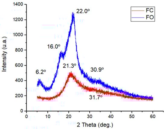 The XRD analysis was performed following the methodology outlined by Spagnol et al. [37]. The XRD analysis was performed using a Shimadzu XRD-6000 diffractometer (Shimadzu, Tokyo, Japan), with an applied voltage of 30 kV and a current of 30 mA (Cu Kα radiation, λ = 1.5418 Å). The scanning range covered 2θ angles from 10° to 50°, with a scanning speed of 2°/min. OriginPro software (version 8.5, OriginLab Corporation, Northampton, MA, USA) was used to analyze the resulting diffractograms.