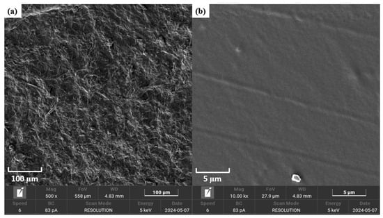 Samples were examined using a MIRA-3 LMH microscope (Tescan, São Paulo, SP, Brazil) featuring a high-brightness font and functioning under high vacuum. The films were secured onto aluminum holders with double-sided carbon tape and coated with a gold layer to ensure conductivity. Imaging was conducted using MiraTC software (version 3) at an accelerating voltage of 5 kV, employing secondary electron (SE) detectors set to a flux of 1750 mA, and magnifications ranging from 500× to 10,000×.