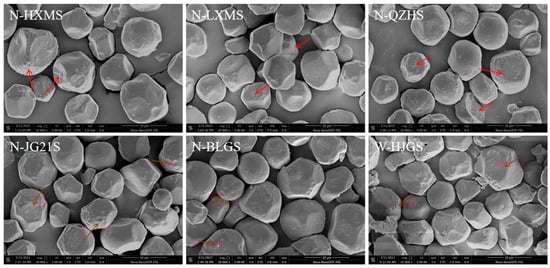 Five types of non-waxy foxtail millet (Heixiaomi, Lvxiaomi, Qinzhouhuang, Jingu21, Bailianggu) and one waxy foxtail millet (Hongjiugu) were obtained from the Agricultural Technology Promotion Center of Shenmu in Yulin, China. All foxtail millet varieties were grown at the experimental open farm of Agricultural Technology Promotion Center of Shenmu in Yulin, China (38°83′ N, 110°51′ E). Six FMSs were successfully extracted following the wet milling method reported by Ji et al. [16], named N-HXMS, N-LXMS, N-QZHS, N-JG21S, N-BLGS, and W-HJGS. The extracted starches had a purity of no less than 95% and were stored in a vacuum desiccator at room temperature. All the chemicals used were of analytical grade.