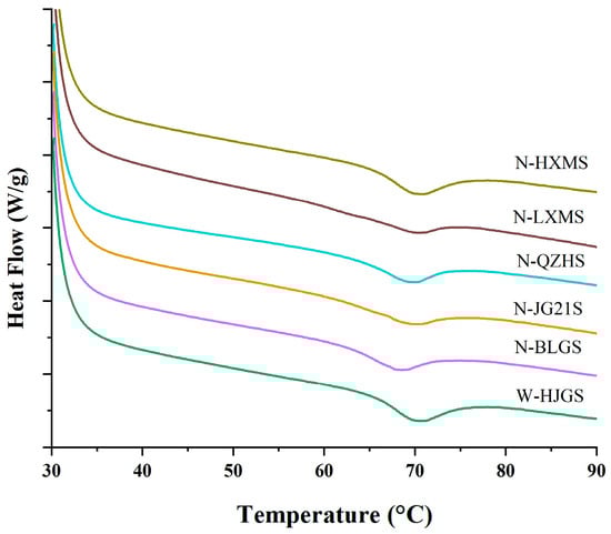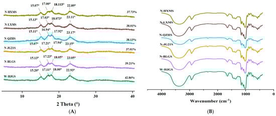 As illustrated in Figure 2B, the FTIR spectra of the six FMSs showed similar profiles, suggesting that the major functional groups present in different FMSs were consistent [7]. According to Romero-García et al. [41], the broad absorption band near 3306 cm−1 is typically attributed to O–H stretching vibrations. Bands near 2929 cm−1 and 2883 cm−1 are generally assigned to the asymmetric and symmetric stretching modes of –CH and –CH2 moieties, respectively. A distinct band around 1329 cm−1 is related to the in-plane bending vibration of CH2 groups. The absorption band at 1147 cm−1 corresponds to stretching vibrations involving C–C and C–O–C bonds, while the bending vibrations of the COH groups are usually associated with the band at 1079 cm−1. Around 1015 cm−1, a combination of C–C and C–O stretching, along with COH in-plane bending vibrations, can be observed. Bands near 994 cm−1 and 926 cm−1 are typically linked to the bending vibrations of C-O-C bonds in starch backbone, CCH, and COH groups. The absorption bands at 1047, 1022, and 1000 cm−1 fall within the 1100–900 cm−1 region, which is known to be sensitive to changes in starch structure [42]. Previous studies have associated the 1047 cm−1 band with more ordered regions (e.g., double helices), and the 1022 cm−1 band with less ordered, amorphous regions [28,42,43,44]. The absorbance ratio R1047/1022 is thus often used as a qualitative index of short-range order [42,43,44]. As shown in Table 2, there were differences in the degree of short-range order of different types of FMSs (p < 0.05). Among five types of non-waxy FMSs, N-BLGS showed the highest R1047/1022 value (0.853), while N-QZHS exhibited the lowest (0.767). The R1047/1022 ratio (0.863) of W-HJGS was significantly higher than that of the non-waxy starches (p < 0.05). Similar observations had been found in waxy and normal wheat starches reported by Sun et al. [32], who found that starches with lower AC and higher crystallinity were more likely to form a more ordered short-range structure. Additionally, researchers also demonstrated that more amylopectin long branches could promote the creation of a more ordered short-range structure [35]. The ordered short-range structure of starch was influenced by its botanical source, amylose content, long amylopectin branch content, and crystallinity [7,28,32].