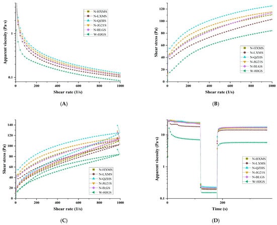Apparent viscosity plot against shear rate (A), shear stress against shear rate (B,C), recovery curve (D) of different FMSs.