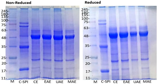 All novel-assisted extraction methods produced protein isolates with purity above 80% (80.57–86.61 g/100 g), meeting the criteria for classification as protein isolates. MAE yielded the highest protein content (86.61 g/100 g), followed by UAE (83.56 g/100 g), closely comparable to C-SPI (94.01 g/100 g). The superior performance of MAE is likely due to microwave-induced rapid heating, which disrupts cell structures and hydrophobic interactions, enhancing more protein recovery. These findings are consistent with earlier studies reporting higher protein purity with MAE than UAE and EAE [14,23]. Authors attributed this enhancement to the local heating effect of microwaves, which disrupts hydrogen bonds and hydrophobic interactions, thus, facilitating the release of tightly bound proteins and improving purity [23]. Comparable levels of protein purities have also been reported in some traditional protein sources, such as pea, soy, and faba bean isolates [24,25]. On the contrary, Tang et al. [26] reported a high protein content of 93.84% for moringa seed protein extracted using the traditional alkaline method. The variation may be attributed to differences in extraction conditions and seed variety. The lack of significant improvement in protein content seen in EAE (80.57 g/100 g) compared to CE (80.47 g/100 g) could be due to partial protein hydrolysis during enzyme treatment, as indicated by the SDS-PAGE (Figure 1), which could have lowered the measurable protein content [27].