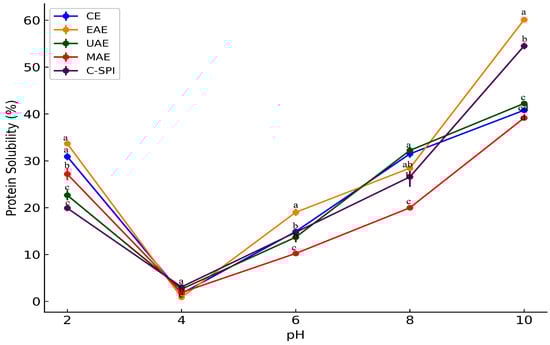 Impact of extraction method on protein solubility pattern of MSPI. Different letters indicate statistically significant differences among treatments (p < 0.05). CE: Alkaline extraction, EAE: enzyme-assisted extraction, UAE: ultrasonic-assisted extraction, MAE: microwave-assisted extraction.