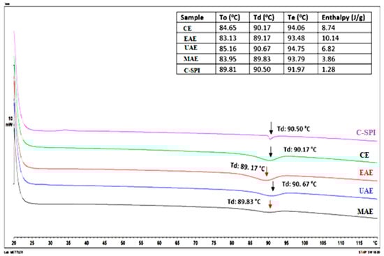 Effect of different novel-assisted extraction methods on thermal properties of MSPI. C-SPI: commercial soybean protein isolate, CE: alkaline extraction, EAE: enzyme-assisted extraction, UAE: ultrasonic-assisted extraction, MAE: microwave-assisted extraction. To: Onset temperature, Td: denaturation temperature, Te: end temperature.