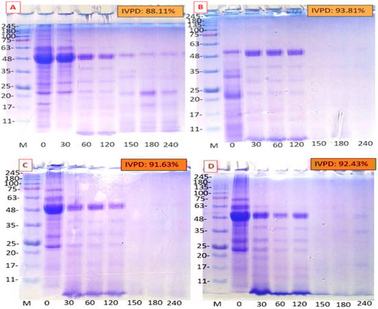 Influence of extraction technique on in vitro protein digestibility pattern of MSPI. (A): Alkaline extraction, (B): enzyme-assisted extraction, (C): ultrasonic-assisted extraction, (D): microwave-assisted extraction. IVPD: in vitro protein digestibility. Gel used: 12% separating gel and 4% stacking gel. 15 μg protein was loaded in each lane.