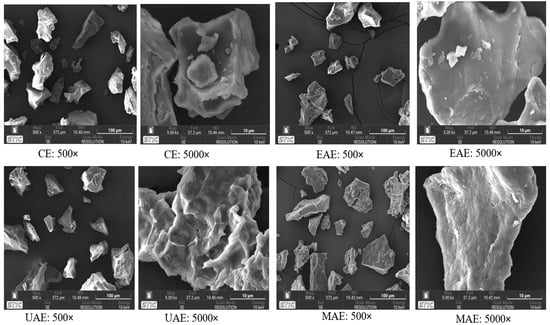 Scanning electron microscopy characteristics of moringa seed protein isolate. CE: Alkaline extraction, EAE: enzyme-assisted, UAE: ultrasonic-assisted, MAE: microwave-assisted. 500× and 5000×: Magnifications.