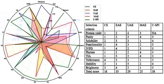 The radar plot and scoring table which compare the performance of MSPIs extracted via different methods across multiple criteria are shown in Figure 6. The C-SPI used as benchmark achieved the highest total score of 38, followed closely by EAE with a total of 35. The overall ranking based on total scores was C-SPI > EAE > UAE > MAE > CE. EAE demonstrated superior performance in key properties, such as protein solubility, IVPD, functional properties, and reduction in ANFs (i.e., phytate and TIA). It also scored highest in color quality, reflecting better visual appeal. UAE achieved the highest score in protein yield and thermal stability, while MAE had a high protein purity score but scored lowest on solubility and color attributes. The control sample (CE) consistently showed the lowest scores across most parameters.