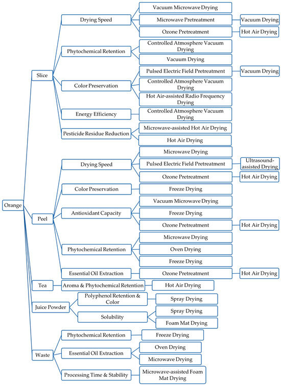 According to the literature review over the past five years, we summarized orange-derived products prepared using different drying technologies and drew a visual decision tree of “product type-constraints-recommended drying method with pretreatment”, as shown in Figure 1.