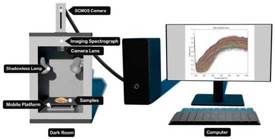 The GaiaField portable hyperspectral system (Sichuan Dualix Spectral Imaging Technology Co., Ltd.) is shown in Figure 1, which includes a GaiaField-V10E hyperspectral camera, a 2048 × 2048 pixel imaging lens, an HSI-CT-150 × 150 standard whiteboard (PTFE), an HSIA-DB indoor imaging dark box, four sets of shadowless lamp light sources, an HSIA- TP-L-A tripod rocker arm set, and hyperspectral data acquisition software Spec View. The spectral range is 870–1709 nm, the spectral band is 512, the spectral resolution is 2.8 nm, the numerical aperture is F/2.4, the slit size is 30 mm × 14.2 mm, the detector is SCMOS, and the imaging modes are built-in push-scan, autofocus, and the dynamic range is 14 bits. The core components of the hyperspectral equipment include a standardized light source, a spectral camera, an electronically controlled mobile platform, a computer and a control software. The system works by using a push-scan imaging mode that combines a surface array detector with an imaging spectrometer. Driven by the scanning-controlled motorized platform, the slit of the imaging spectrometer and the focal plane of the imaging lens move relative to each other, and the detector collects real-time information relative to the line target, which is finally stitched together into a complete data cube.