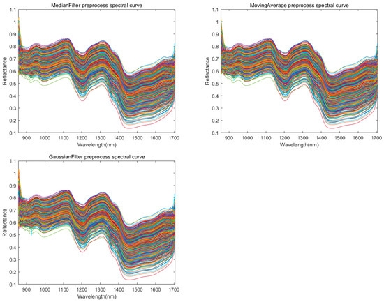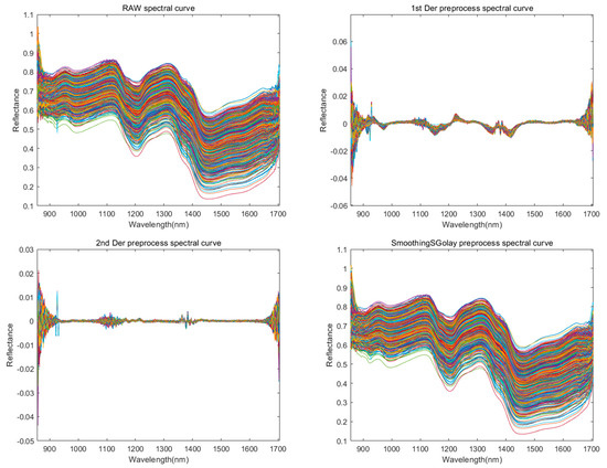In the process of using hyperspectral instruments to collect images, it is inevitable to be interfered by instrumental noise, environmental noise, etc. In order to reduce the interference of extraneous information, improve the quality of the obtained data, and make the acquired spectral data better reflect the sample information, and ensure that the established model obtains more accurate prediction results, it is necessary to carry out the preprocessing of spectral data. In this study, the first-order derivative (1st Der), second-order derivative (2nd Der) [20], polynomial smoothing (SG) [21], Gaussian filter (GF) [22], median filter (MF) [23], and moving average filter (MA) [24] are used as preprocessing methods to preprocess the raw spectral data. The first-order derivatives can keenly capture the trend of data changes, amplify the information such as the change in curve slope, and highlight the increase or decrease in data at each point, which is conducive to analyzing the dynamic characteristics of the data [25]. To a certain extent, it can weaken the noise interference in the smooth region, make the details of the changes originally covered by noise clearer, improve the quality of data, and facilitate the subsequent accurate analysis and modeling. Converting the original data into derivative form can simplify the data expression by retaining the key change characteristics, reducing data redundancy, and improving processing efficiency.
