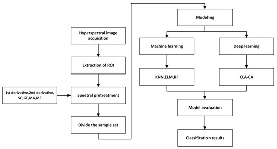 Flow chart of the experiment. This process begins with acquiring hyperspectral images, followed by extracting regions of interest to obtain spectral curves and performing preprocessing. Subsequently, the dataset is partitioned and classified using different models, with the classification results compared.