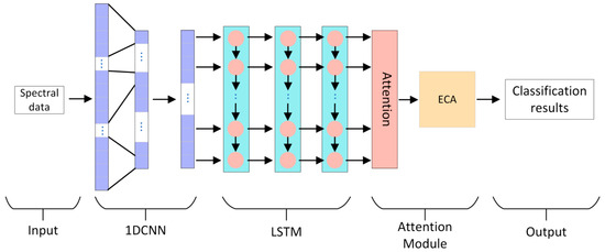 In existing studies, the classification of corn varieties usually uses fewer varieties, which is difficult to ensure under the realistic conditions of many corn varieties; there is still a better classification effect. In most studies, the operation of selecting the characteristic wavelengths is performed first [18], which can reduce the influence of non-correlated variables and improve the model performance, but it also means that it may lead to the loss of some spectral information. Therefore, this study chose to use 30 different varieties of corn as the research object, which is close to the actual situation. At the same time, the experiment is carried out using the whole waveband to avoid the loss of spectral information, and it can reduce the influence of human operation and simplify the experimental operation. The deep learning model and the attention mechanism in the above study have good performance effects in various aspects, so this study uses 1DCNN as the basic network model, and adds LSTM and attention mechanism for improvement, in order to achieve the purpose of accurate classification.