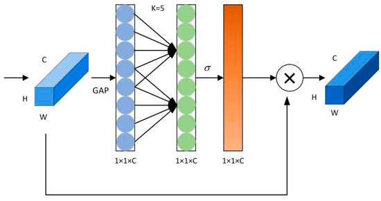 ECA structure. Based on the aggregated features obtained via Global Average Pooling (GAP), ECA generates channel weights by performing fast one-dimensional convolutions of size k, where k is adaptively determined through mapping the channel dimension C.