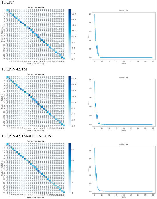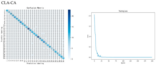 Secondly, ablation experiments are conducted on different parts of the model to test the effect of adding parts such as LSTM, ATTENTION, and ECA modules to the 1DCNN on the experimental results, respectively. Firstly, by adding LSTM to the CNN network model after first-order derivative preprocessing, the accuracy of the test set is improved from 90.27% to 92.94%, which is an improvement of 2.67%, and the precision and recall are improved by 1.64% and 2.30%, respectively. Then, when ATTENTION is added into the network model, the accuracy is improved to 93.43%, which is an improvement of 0.49%, and the precision and recall are improved by 1.36% and 0.40%, respectively, proving that LSTM and ATTENTION can work together in CNN network, and both of them can improve the classification accuracy of the overall network at the same time. Therefore, this study chooses CNN-LSTM-ATTENTION as the base network model and adds the ECA module on top of it to construct the model CLA-CA used in this study. After adding this module, the overall model accuracy is increased to 95.38%, which is an overall improvement of 1.95%, and the precision and recall are increased by 0.14% and 0.84%, respectively, the model runtime did not increase much compared to the original model, which proves that the ECA module is able to focus on different channel features, thus improving the accuracy of model classification. The results and loss function of the confusion matrix are shown in Figure 7. The ablation results are shown in Table 6.