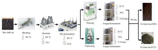Briefly, three parallel batches of FBT and FLT samples were obtained from Xianyang Jingwei Fu Tea Co., Ltd. (Xianyang, China), and samples were collected from different production batches. The samples were produced using the same black tea raw materials according to the Chinese Tea Industry Standard GH/T 1246-2019 [25]. Samples were stored at −20 °C before further analysis.
