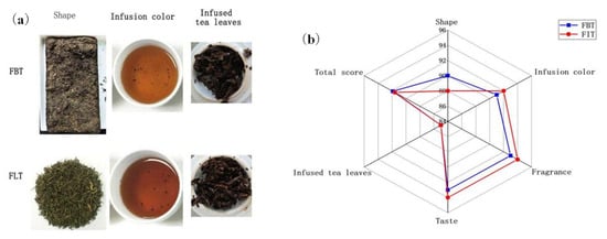 (a) The appearance of Fu tea, shape, infusion color, and infused tea leaves of Fu brick tea (FBT) and Fu loose tea (FLT) (from left to right); (b) radar plot of sensory descriptor scores of FBT and FLT.