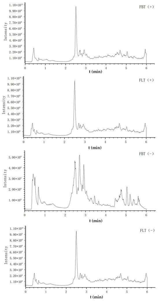 Figure 3 shows the typical total ion chromatogram (TIC) of FBT and FLT in different modes, respectively. The TICs of FBT and FLT obtained in the positive ion mode were very similar, while those obtained in the negative ion mode before and after 3 min and 4.5 min were significantly different, which was mainly manifested in the peak height and peak area. The comprehensive analysis suggested that the difference between FBT and FLT may be related to compound levels, laying the foundation for subsequent multivariate statistical analysis.