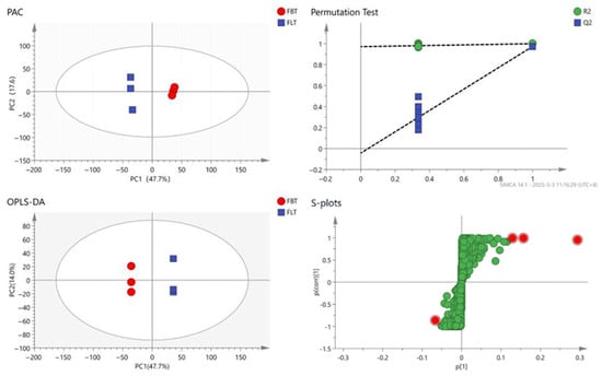 Principal component analysis (PCA) score plot; orthogonal partial least squares discriminant analysis (OPLS-DA) score plot; permutation test plot: The dotted lines represent the R2 and Q2 values of the original, non-permuted model between FBT and FLT; s-plots for FBT and FLT: The red dots represent the highlighted compounds selected, while the green dots represent the remaining compounds.