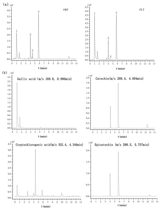Metabolomics analysis of Fu tea samples by UHPLC-Q-TOF-MS/MS under negative ionization polarity mode. (a) The typical total ion chromatogram (TIC) of FBT and FLT (1. gallic acid; 2. catechin; 3. cryptochlorogenic acid; 4. epicatechin). (b) Extracted ion chromatograms (EICs) of the four identified compounds.