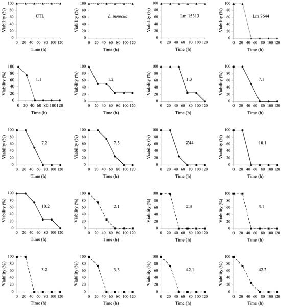 Mortality rates in chicken embryos post-inoculation with wild-type Listeria monocytogenes isolates over 120 h. CTL, control solution with NaCl 0.9%. Lm 15313, negative infection control Listeria monocytogenes ATCC 15313. L. innocua, negative infection control Listeria innocua ATCC 33091. Lm 7644, positive infection control Listeria monocytogenes ATCC 7644. Graphs with filled triangles and dotted lines belong to the control strains. Graphs with filled circles belong to isolates from raw pork loin. Graphs with filled squares and dotted lines belong to isolates from raw package pork loin.