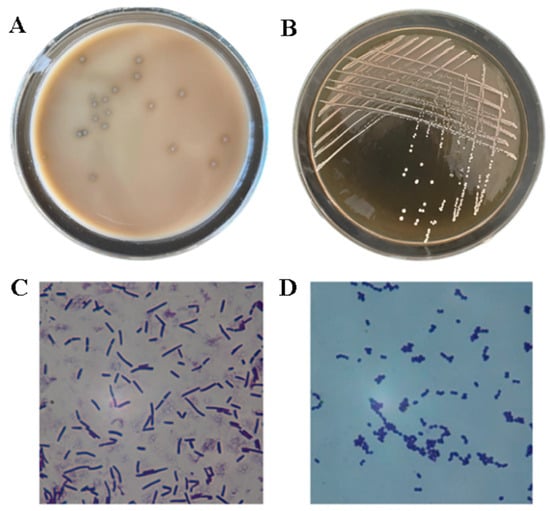 The cheese-ripening bacterial suspension was evenly spread on a 2% CaCO3 MRS solid medium. After 48 h of cultivation, distinct transparent halos formed around the colonies (Figure 1A). Lactobacilli are characterized by their ability to secrete lactic acid that dissolves CaCO3, leading to the preliminary identification of calcium-dissolving colonies as suspected LAB strains. These suspected LAB colonies exhibited partial whitening, opaque appearance, neat margins, and smooth, flattened circular shapes. Some colonies showed irregular white translucent forms with central circular protrusions. The suspected LAB strains were isolated using the three-zone streak technique (Figure 1B). Microscopic examination revealed short rod-shaped or spherical bacterial bodies with purple coloration, exhibiting typical Gram-positive characteristics (Figure 1C,D). Hydrogen peroxide enzyme tests demonstrated bubble formation in all tested strains, yielding negative results. These tests confirmed that the isolated strains possess characteristic LAB traits and were suspected LAB.