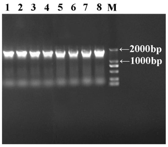 Electrophoresis diagram of PCR products of eight isolated strains. Note: M: marker; 1: ZYN-51; 2: ZYN-54; 3: ZYN-65; 4: ZYN-66; 5: ZYN-70; 6: ZYN-71; 7: ZYN-76; and 8: ZYN-84.