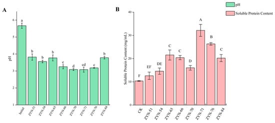 After 24 h of cultivation, the acid-producing capacity of eight isolated strains showed significant differences (p < 0.05) (Figure 4A). The initial pH value in the culture medium was 5.80. After fermentation, the pH value of eight isolated strains ranged between 3.00 and 3.90. Among them, strains ZYN-66 (3.18), ZYN-71 (3.01), ZYN-70 (3.03), and ZYN-76 (3.15) exhibited stronger acid-producing capability, while the pH value of the other strains was above 3.60. Boeck et al. [24] studied LAB-fermented legume protein isolate (LPI) as a yogurt substitute, and found that three LABs had a high acid-producing capacity, reducing the pH value of the fermented liquid from 6.92 to 3.60–4.80. This indicates that the production capabilities of LAB selected from different fermentation substrates show significant variations, likely due to differences in their adaptability to fermentation environments and nutrient utilization capacities.