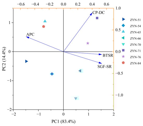 Screening LAB principal component analysis. Note: APC is acid production capacity; CP-DC is hydrolysis capacity; BTSR is bile tolerance survival rate; and SGF-SR is simulated gastric fluid survival rate.