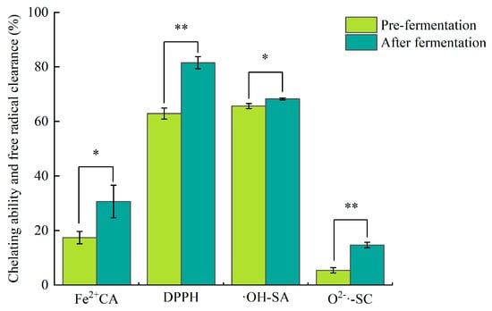 Effects of LAB on antioxidant activity of CPH before and after fermentation. Note: All of them were in the condition of protein content of 1 mg/mL. Different letters in each column indicate significant (* p < 0.05, ** p < 0.01) differences.