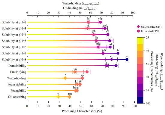 The processing properties determine the application scope, product stability, and flavor characteristics of CPH. Under different pH values (2.0–8.0), the solubility of fermented CPH increased significantly, ranging from 11.0% to 16.5% (Figure 7). Notably, the maximum increase occurred at pH 3.0 (16.1%). The foaming performance improved by 1.61%, while foam stability was enhanced by 6.85%. After fermentation, emulsification increased by 11.47% (p > 0.05), with emulsion stability rose by 8.48%. Water retention and oil retention increased by 16.02% and 10.5%, respectively. These results demonstrate that proteases and organic acids [34] produced by LAB effectively disrupt the spatial conformation of proteins [35] in CPH. They cause structural loosening, weakening intermolecular forces [36], and the breaking of some chemical bonds, thereby providing favorable processing characteristics.
