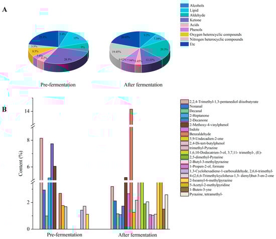Through headspace solid-phase microextraction gas chromatography-mass spectrometry (HS-SPME-GC-MS) analysis, 109 volatile flavor compounds were identified in fermented CPH before and after fermentation, primarily including alcohols, esters, aldehydes, phenols, acids, alkanes, terpenes, oxygen-containing heterocyclic compounds, nitrogen-containing heterocyclic compounds, and other types of compounds (Figure 8A). The ketones (28.5%) were the dominant component before fermentation, while aldehydes (20.2%) and nitrogen-containing heterocyclic compounds (19.4%) became predominant after fermentation. Specifically, the relative content of alcohols increased by 3.8%, aldehydes by 11.3%, and nitrogen-containing heterocyclic compounds by 15.9%. These changes imparted distinct nutty and baked aromas to the fermented CPH [39].